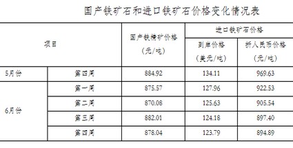6月末,國產(chǎn)鐵精礦價格為878.04元/噸,環(huán)比下降6.88元/噸,降幅為0.78%;進(jìn)口鐵礦石(粉礦)到岸價格為123.79美元/噸,環(huán)比下降10.32美元/噸,降幅為7.70%。折合人民幣價格為894.89元/噸,環(huán)比下降74.74元/噸,降幅為7.71%。