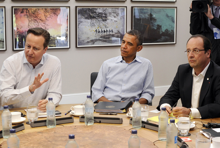 6月18日,在英國北愛爾蘭西部厄恩湖,英國首相卡梅倫(左)、美國總統(tǒng)奧巴馬(中)和法國總統(tǒng)奧朗德參加八國集團峰會工作會議。新華社/法新 |
