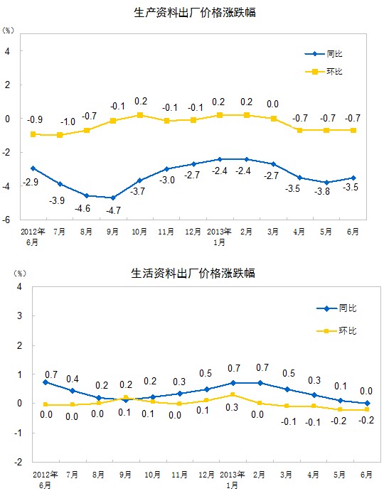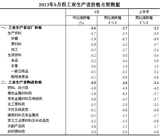 2013年6月份,全國(guó)工業(yè)生產(chǎn)者出廠價(jià)格同比下降2.7%,環(huán)比下降0.6%。工業(yè)生產(chǎn)者購(gòu)進(jìn)價(jià)格同比下降2.6%,環(huán)比下降0.5%。上半年,工業(yè)生產(chǎn)者出廠價(jià)格同比下降2.2%,工業(yè)生產(chǎn)者購(gòu)進(jìn)價(jià)格同比下降2.4%。