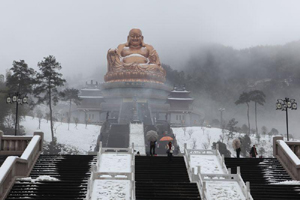 到奉化旅游,一般都要到雪竇山看看彌勒大佛。大佛位于奉化市溪口鎮(zhèn)的雪竇山后山海拔369米山坡上,坐北朝南,左手提布袋,右手握佛珠,慈眉善目,袒胸露腹,笑容可掬。這是以奉化布袋和尚基本形態(tài)為造型的中國化彌勒佛像。大佛居高臨下,與整個巖體連成一體,扎實堅固,穩(wěn)如磐石,宏偉壯觀,氣勢非凡,寶相莊重,做工精美,栩栩如生。