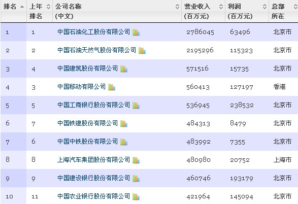 北京時間2013年7月16日,財富中文版正式發(fā)布2013年中國500強排行榜。中石化、中石油分別蟬聯(lián)第一、第二名,中國建筑股份有限公司取代中國移動有限公司成為第三名。今年,中國500強上榜的門檻繼續(xù)提高到72.5億元。四大銀行成為中國500強中最賺錢的公司。