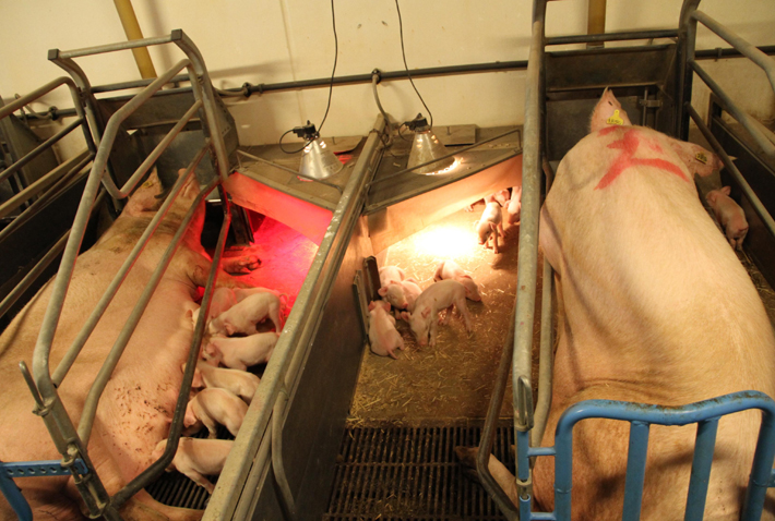 養(yǎng)豬場產(chǎn)房里的母豬和剛出生的小豬。楊敬忠/攝 |