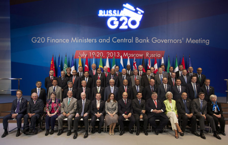 7月20日,出席二十國集團(tuán)財(cái)政部長和央行行長會(huì)議的代表在俄羅斯首都莫斯科馬涅什展覽中心會(huì)場內(nèi)合影。 當(dāng)日,二十國集團(tuán)財(cái)長和央行行長會(huì)議在莫斯科閉幕,會(huì)后發(fā)表的聯(lián)合公報(bào)敦促各國審慎調(diào)整貨幣政策,加強(qiáng)與其他國家的溝通與協(xié)調(diào)。