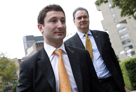 22日,前高盛集團(tuán)交易員法布里·圖雷(左)在律師陪伴下到達(dá)紐約曼哈頓聯(lián)邦法庭,準(zhǔn)備出庭受審。美國證券交易委員會(huì)起訴圖雷在2007年高盛發(fā)售的一款合成債務(wù)抵押證券中誤導(dǎo)投資者,遺漏關(guān)鍵信息并對(duì)產(chǎn)品作出錯(cuò)誤陳述。被稱為“神奇的法布里”的圖雷在這筆名為Abacus 2007-AC1的金融衍生產(chǎn)品上最后令投資者損失10多億美元。