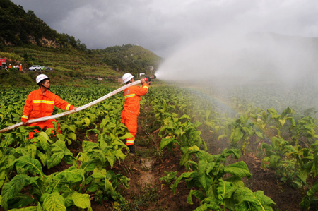 圖為7月29日消防官兵在貴州貞豐縣平街鄉(xiāng)幫助旱區(qū)群眾澆水。