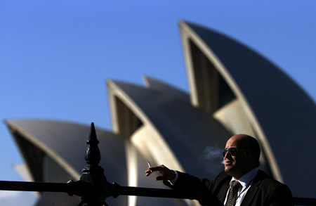澳大利亞國庫部長克里斯·鮑恩與衛(wèi)生和醫(yī)學(xué)研究部長塔尼婭·普利伯塞克1日共同發(fā)表聲明,宣布澳大利亞將在未來4年內(nèi)每年將煙草稅提高12.5%,用于治療與煙草相關(guān)的癌癥,并幫助聯(lián)邦政府重獲財政盈余。 圖為當日一名男子在澳大利亞悉尼歌劇院前抽煙。