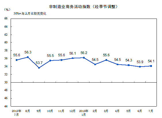 2013年7月,中國非制造業(yè)商務(wù)活動指數(shù)為54.1%,比上月小幅上升0.2個(gè)百分點(diǎn)。