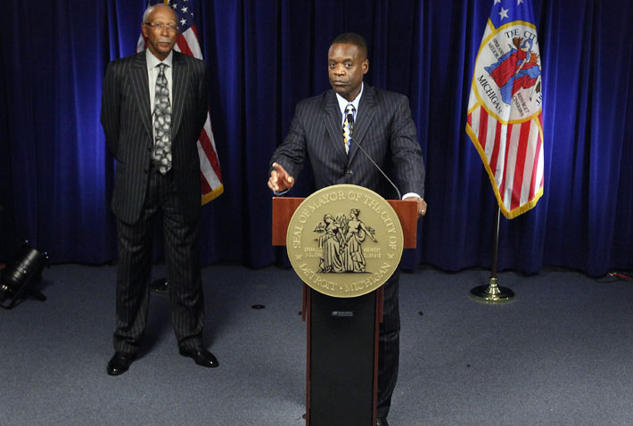 7月18日,美國底特律緊急財政管理人凱文·奧爾(右)在底特律出席新聞發(fā)布會。奧爾當天獲密歇根州州長里克·斯奈德授權(quán),向位于底特律的美國破產(chǎn)法院遞交破產(chǎn)申請。新華社/美聯(lián)
