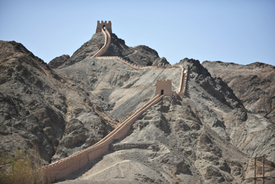 明嘉靖十八年(1539年)由肅州兵備道李涵監(jiān)筑,此段長(zhǎng)城從關(guān)城東閘門(mén)邊的角墩起向北延伸至黑山山腰,全長(zhǎng)7.5公里。山腰長(zhǎng)城約750米,陡峭直長(zhǎng),氣勢(shì)雄偉,垂若懸臂,故有“西部八達(dá)嶺”之稱。