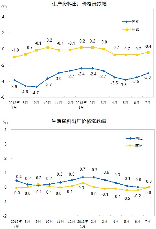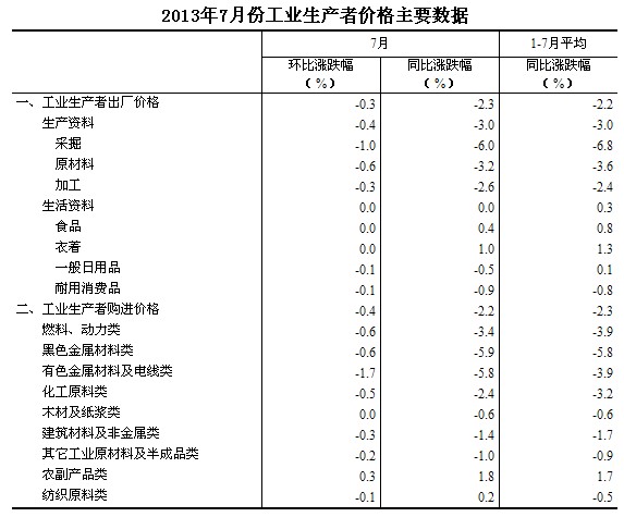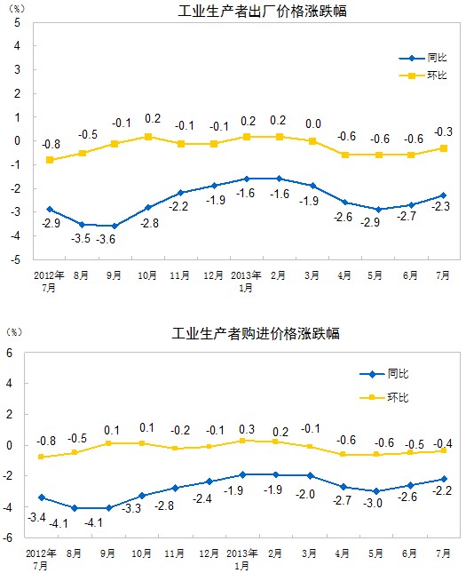 2013年7月份,全國工業(yè)生產(chǎn)者出廠價格同比下降2.3%,環(huán)比下降0.3%。工業(yè)生產(chǎn)者購進價格同比下降2.2%,環(huán)比下降0.4%。1-7月平均,工業(yè)生產(chǎn)者出廠價格同比下降2.2%,工業(yè)生產(chǎn)者購進價格同比下降2.3%。