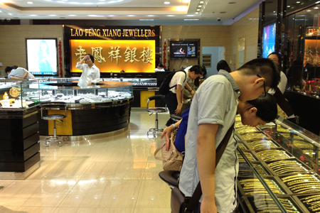 8月12日,國家發(fā)展和改革委員會宣布,上海黃金飾品行業(yè)協(xié)會因組織部分金店壟斷黃金、鉑金飾品價格,被處以最高50萬元罰款;5家金店因壟斷價格被處以上一年度相關(guān)銷售額1%的罰款,共計人民幣1009.37萬元。 圖為當(dāng)日在上海某商場里的“老鳳祥銀樓”店鋪,顧客在選購黃金產(chǎn)品。