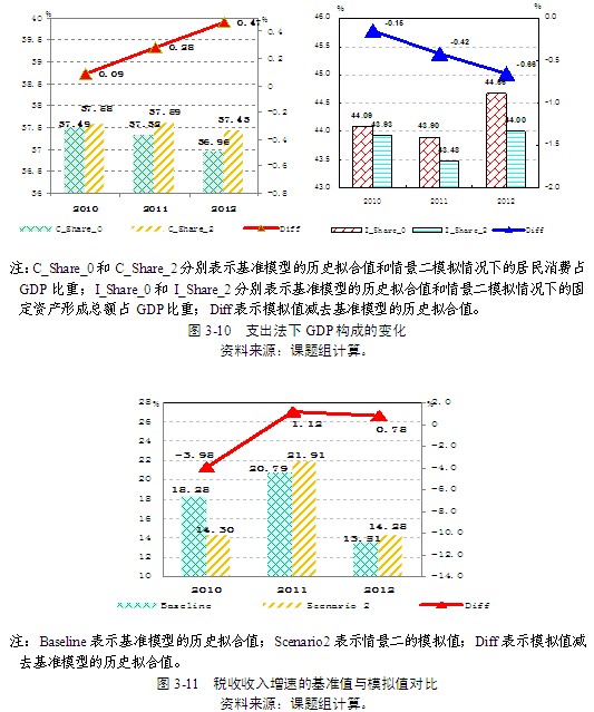 第三,得益于居民消費(fèi)需求的擴(kuò)大以及經(jīng)濟(jì)增長(zhǎng)的加快,企業(yè)自籌投資增速相較基準(zhǔn)模擬水平也有所提高。同時(shí),稅收收入增速也逐漸加快。與基準(zhǔn)模型的歷史擬合值相比,在2010-2012年期間,稅收收入增速先降低3.98百分點(diǎn),之后提高1.12、0.78個(gè)百分點(diǎn)(圖3-11)。財(cái)政總收入占GDP的比重分別下降0.4、0.78和0.89個(gè)百分點(diǎn)(圖3-12)。