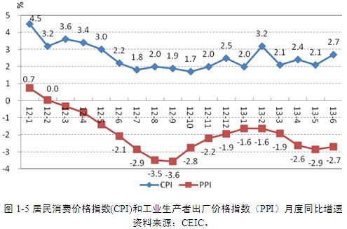 至2013年6月(圖1-5),消費者價格指數(shù)(CPI)同比上漲2.7%,其中翹尾因素貢獻(xiàn)70.4%,當(dāng)年價格上漲因素貢獻(xiàn)29.6%。扣除食品和能源的CPI上漲1.7%,非食品CPI上漲1.6%。結(jié)合環(huán)比數(shù)據(jù),上半年CPI的變化較為平緩。另一方面,工業(yè)生產(chǎn)者出廠價格指數(shù)(PPI)持續(xù)下降。至6月,PPI同比下跌2.7%,而且下跌的幅度不斷擴大。PPI下降可能源自于大宗商品價格的下跌;⑴同時也是現(xiàn)階段中國鋼鐵、煤炭、玻璃、鋁、光伏、水泥等行業(yè)(結(jié)構(gòu)性)產(chǎn)能過剩的體現(xiàn)。