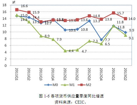 2013年上半年貨幣政策基本維持穩(wěn)健趨緊的態(tài)勢,貨幣信貸增速平穩(wěn)下滑。第一季度廣義貨幣供應(yīng)量(M2)同比增長15.7%,第二季度增長14%,分別比上年同期下降了2.46和4.47個百分點。至6月末,流通中現(xiàn)金(M0)增長9.7%,比上年同期下降1.1個百分點。上半年人民幣貸款余額同比增長14.2%,比上年同期下降1.8個百分點;新增貸款5.1萬億元,同比多2218億元。其中,新增貸款中房地產(chǎn)行業(yè)所占比重大幅度增長,約占25.6%,比上年同期提高了近14個百分點。與此同時,上半年社會融資總量快速增長,至6月同比增速達(dá)到30.5%。人民幣新增貸款占社會融資總量的比重為50%,比上年同期下降19.9個百分點。