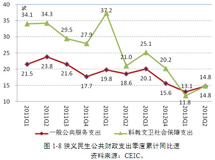 綜上,2013年上半年外部市場需求低迷加上國內(nèi)產(chǎn)能過剩,導(dǎo)致工業(yè)生產(chǎn)增長乏力,經(jīng)濟(jì)增速持續(xù)下降,公共財政收入增速大幅下滑。盡管價格水平保持平穩(wěn),但是,城鄉(xiāng)居民實際收入增速的減緩,從根本上抑制了居民消費需求的擴張。國有企業(yè)投資、國內(nèi)貸款投資以及交通運輸領(lǐng)域投資增速的大幅度提高,一定程度上抵消了私人部門制造業(yè)投資增速的下滑,使固定資產(chǎn)投資增速得以保持穩(wěn)定增長。投資依然是經(jīng)濟(jì)增長的主要動力,中國經(jīng)濟(jì)結(jié)構(gòu)失衡的局面也在繼續(xù)。下半年,雖然世界經(jīng)濟(jì)的恢復(fù)性增長將有利于緩解中國出口增長持續(xù)下降的壓力,使中國經(jīng)濟(jì)2013年有望實現(xiàn)中央年初制定的7.5%的增長目標(biāo)。但是,經(jīng)濟(jì)結(jié)構(gòu)失衡的局面不僅沒有改善的跡象,相反,卻有進(jìn)一步加劇的趨勢,尤其是在公共財政收入增速下降的背景下,公共財政支出中用于民生的支出增速比政府的一般公共服務(wù)支出增速更為急劇地下降,抑制了公共財政支出向民生領(lǐng)域的傾斜,城鄉(xiāng)居民實際收入增速的下滑,都將阻礙中國經(jīng)濟(jì)轉(zhuǎn)變經(jīng)濟(jì)發(fā)展方式、調(diào)整經(jīng)濟(jì)結(jié)構(gòu)失衡,居民收入與經(jīng)濟(jì)的同步增長。