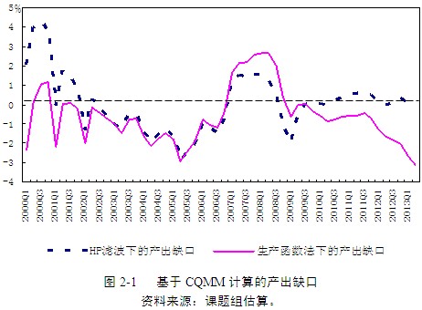 計算產(chǎn)出缺口的一種常用方法是利用H-P濾波計算實際產(chǎn)出與其趨勢(潛在產(chǎn)出)的缺口。圖2-1表明利用這種方法計算的產(chǎn)出缺口與現(xiàn)實存在著背離:近期中國經(jīng)濟(jì)的產(chǎn)出缺口是正的,意味著不存在產(chǎn)能過剩的情況。然而,根據(jù)拓展后的CQMM的估算結(jié)果表明,自2009年起,中國經(jīng)濟(jì)產(chǎn)出缺口就開始呈現(xiàn)出持續(xù)擴(kuò)大的態(tài)勢。這說明,過去三四年期間應(yīng)對金融危機(jī)而采用的擴(kuò)張性政策導(dǎo)致中國經(jīng)濟(jì)不僅存在行業(yè)結(jié)構(gòu)上的產(chǎn)能過剩,而且還存在經(jīng)濟(jì)總量上的產(chǎn)能過剩。