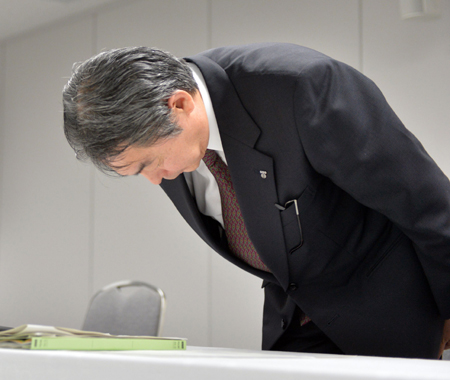 下圖為21日東京電力公司執(zhí)行副總裁Bungo Aizawa在公司總部舉行的新聞發(fā)布會(huì)上鞠躬!》ㄐ律
