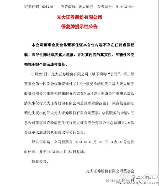 據(jù)上交所官方微博,光大證券股份有限公司第三屆董事會(huì)第十四次會(huì)議,同意接受光大證券總裁徐浩明提出的辭去光大證券股份有限公司董事、總裁職務(wù)的申請。此外,經(jīng)公司申請,光大證券自2013年8月22日13點(diǎn)00分起臨時(shí)停牌,并于2013年8月23日復(fù)牌。