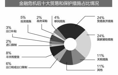 如圖所示,自2008年11月至今,國家援助措施和政府采購已經(jīng)占全部貿(mào)易保護(hù)措施的26%,成為最重要的保護(hù)手段之一。而以往貿(mào)易保護(hù)措施中最常使用的手段是關(guān)稅和非關(guān)稅措施,目前所占的比重已經(jīng)不足1/5。