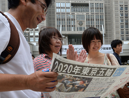 8日,日本民眾在東京都政府大樓門前閱讀日本媒體為東京成功申辦2020年奧運會印刷的號外。阿根廷布宜諾斯艾利斯時間7日晚,在國際奧委會第125次全會上,經(jīng)過兩輪投票和近一個半小時的等待,東京最終獲得主辦權(quán)。日本首相安倍晉三在隨后舉行的新聞發(fā)布會上表示,舉辦奧運會無疑有助于日本經(jīng)濟持續(xù)增長。有報告預(yù)測,2020年東京奧運會可能幫助日本國內(nèi)生產(chǎn)總值(GDP)增長4.2萬億日元(約423.9億美元)。