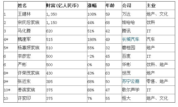前10名中有5位新人,分別是排名第四的魏建軍、排名第五的楊惠妍家族、排名第八的許榮茂家族、排名第九的張近東和排名第十的姜濱家族。涉足地產(chǎn)行業(yè)的富豪人數(shù)最多,達(dá)6位,比去年多一位;以IT為主業(yè)的富豪有3位;以飲料為主業(yè)的富豪有2位。平均年齡為52歲,比去年年輕4歲。有3位上過(guò)胡潤(rùn)百富榜的榜首。