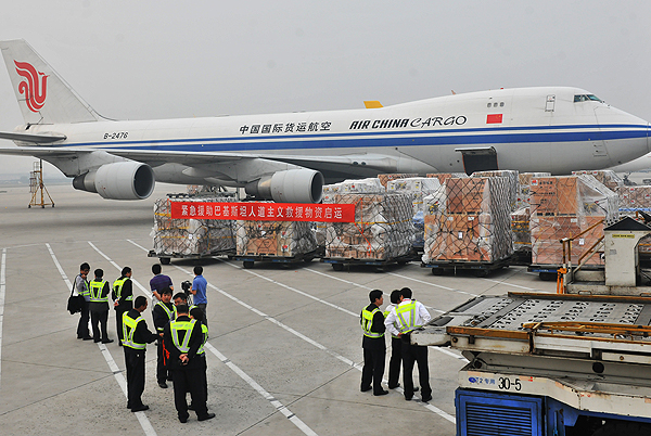 近日,中國(guó)政府決定向發(fā)生地震的巴基斯坦提供人道主義救災(zāi)物資援助,并交由中國(guó)國(guó)際航空股份有限公司(簡(jiǎn)稱“國(guó)航”)所屬的中國(guó)國(guó)際貨運(yùn)航空有限公司(以下簡(jiǎn)稱“國(guó)貨航”)執(zhí)行。9月28日16時(shí)09分,滿載救援物資的CA1093航班B2458號(hào)貨機(jī)從北京首都國(guó)際機(jī)場(chǎng)起飛前往巴基斯坦,于北京時(shí)間22時(shí)30分抵達(dá)巴基斯坦南部城市卡拉奇,機(jī)上裝載了凈水設(shè)備、發(fā)電機(jī)、毛毯、帳篷、藥品等災(zāi)區(qū)急需的生產(chǎn)和生活物資。隨后,另一架運(yùn)送中國(guó)政府緊急人道主義救援物資的波音747-400型B2476號(hào)貨機(jī),也于18時(shí)37分執(zhí)行CA1095航班從北京首都國(guó)際機(jī)場(chǎng)起飛,于北京時(shí)間29日0時(shí)57分抵達(dá)巴基斯坦南部城市卡拉奇。