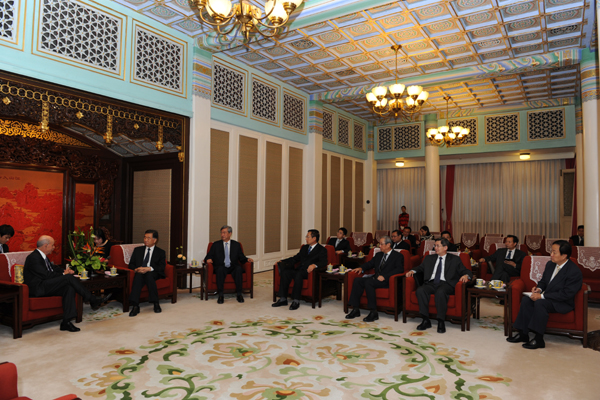 新華社社長李從軍(左三),經(jīng)濟參考報總編輯杜躍進(右一)參與會見
