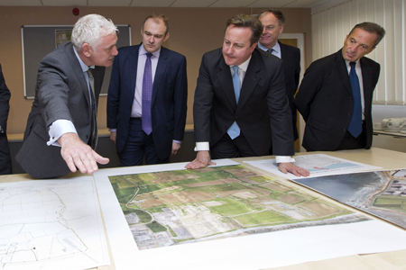 圖為英國首相卡梅倫(左三)當(dāng)日在英國西南部欣克利角查看核電機(jī)組建設(shè)方案。