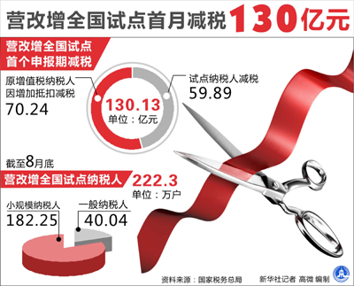 《經(jīng)濟參考報》記者從國家稅務(wù)總局獲悉,1至8月,原增值稅一般納稅人(貨物制造和流通企業(yè))增加抵扣減稅362.7億元。“營改增”全國試點首月,即8月一個月,共減稅130.13億元。