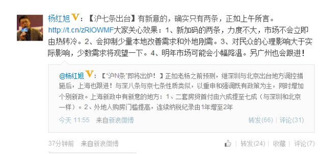 他在微博中分析道,1、新加碼的兩條,力度不大,市場不會立即由熱轉(zhuǎn)冷。2、會抑制少量本地改善需求和外地剛需。3、對民眾的心理影響大于實(shí)際影響,少數(shù)需求將觀望一下。4、明年市場可能會小幅降溫。另廣州也會跟進(jìn)!