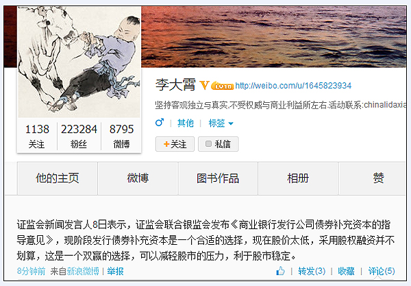 新浪認(rèn)證資料為“英大證券首席經(jīng)濟(jì)學(xué)家”的李大霄在微博上表示,現(xiàn)階段發(fā)行債券補(bǔ)充資本是一個(gè)合適的選擇,現(xiàn)在股價(jià)太低,采用股權(quán)融資并不劃算,這是一個(gè)雙贏的選擇,可以減輕股市的壓力,利于股市穩(wěn)定。