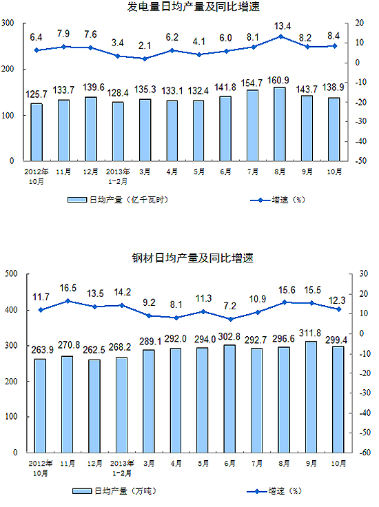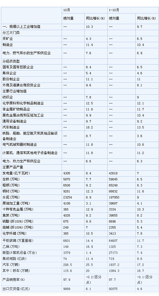 分產(chǎn)品看,10月份,464種產(chǎn)品中有328種產(chǎn)品同比增長。其中,發(fā)電量4305億千瓦時,同比增長8.4%;鋼材9281萬噸,增長12.3%;水泥23254萬噸,增長8.9%;原油加工量4108萬噸,增長3.1%;十種有色金屬365萬噸,增長12.9%;乙烯149萬噸,增長16.9%;汽車208.5萬輛,增長25.5%;轎車115.6萬輛,增長20.0%。