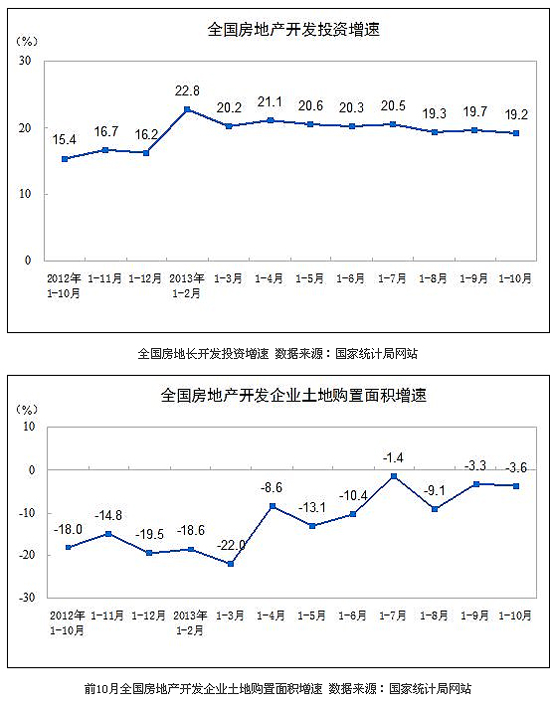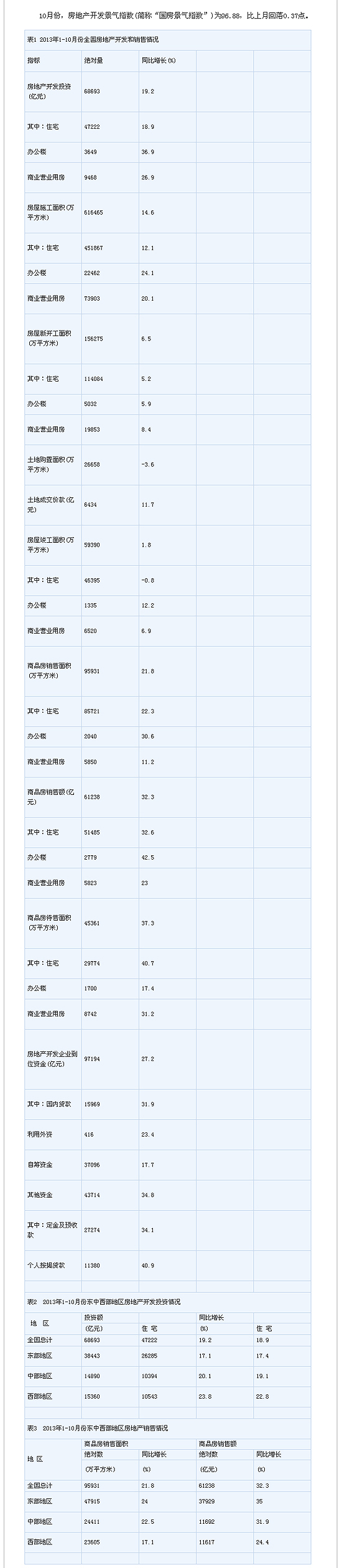 2013年1-10月份,全國房地產(chǎn)開發(fā)投資68693億元,同比增長19.2%,增速比1-9月份回落0.5個(gè)百分點(diǎn)。其中,住宅投資47222億元,增長18.9%,增速回落0.6個(gè)百分點(diǎn),占房地產(chǎn)開發(fā)投資的比重為68.7%