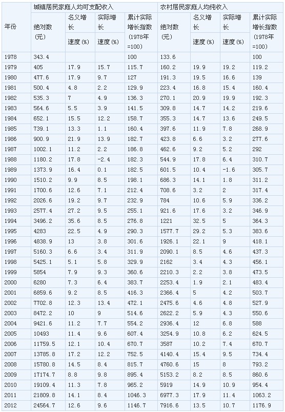 根據(jù)國(guó)家統(tǒng)計(jì)局每年對(duì)十幾萬(wàn)戶居民家庭的直接調(diào)查結(jié)果,從1978年到2012年,扣除物價(jià)上漲因素后,全國(guó)城鎮(zhèn)居民人均可支配收入實(shí)際增長(zhǎng)10.5倍,年均實(shí)際增長(zhǎng)7.4%;全國(guó)農(nóng)村居民人均純收入實(shí)際增長(zhǎng)10.8倍,年均實(shí)際增長(zhǎng)7.5%。