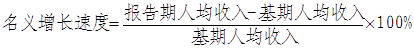 名義增長(zhǎng)速度。主要反映居民持有貨幣收入的增減變化情況。計(jì)算方法是用報(bào)告期居民人均收入減去基期居民人均收入再除以基期居民人均收入。計(jì)算公式為: