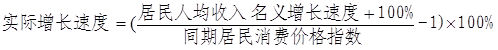 實(shí)際增長(zhǎng)速度。主要反映居民持有貨幣收入所能形成的實(shí)際購(gòu)買(mǎi)力增減變化情況。計(jì)算方法是在居民人均收入名義增長(zhǎng)速度中扣除同期的居民消費(fèi)價(jià)格指數(shù)。計(jì)算公式為:
