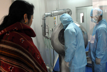 專家學(xué)者、宗教界人士和醫(yī)護(hù)人員代表日前齊聚一堂,共同慶祝北京藏醫(yī)院成立20周年,并參觀北京藏醫(yī)院新設(shè)立在北京市昌平區(qū)南口鎮(zhèn)的藏藥研究和加工機(jī)構(gòu)。目前,北京藏醫(yī)院制作了500余種藏藥材標(biāo)本,根據(jù)國家要求開始制定藏藥標(biāo)準(zhǔn),旨在為藏醫(yī)藥發(fā)展打下堅(jiān)實(shí)的基礎(chǔ)。圖為與會者在參觀北京藏醫(yī)院南口基地的藏藥生產(chǎn)。