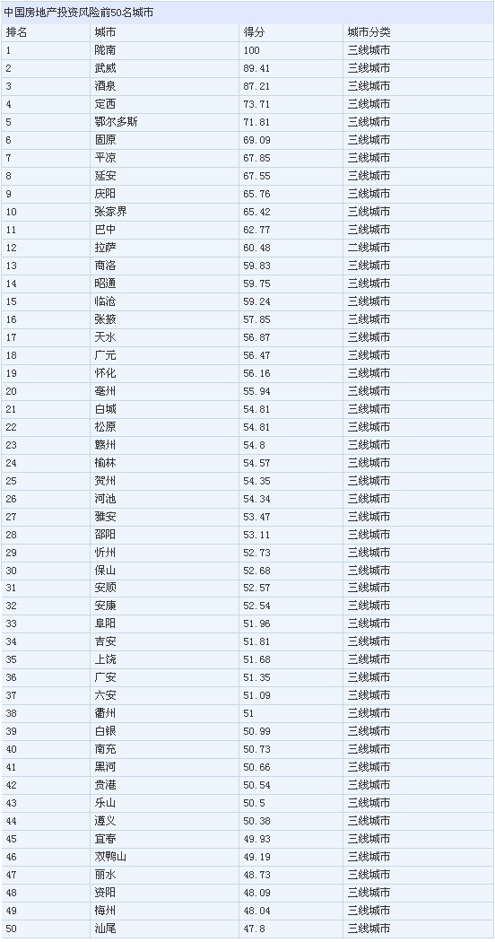 易居(中國)控股有限公司執(zhí)行總裁丁祖昱對記者分析,風(fēng)險排在前50位的基本上都是三線城市,有個別二線城市。在發(fā)展前景前50位的城市當(dāng)中,以一二線城市為主,三線城市的數(shù)量比較少,即使有,也是東部較發(fā)達的一些地級市。