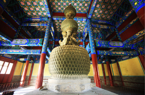 中國(guó)古代最精美的銅鑄毗盧佛 毗盧殿位于隆興寺中軸線最末端,殿內(nèi)的毗盧佛堪稱國(guó)寶,毗盧佛設(shè)計(jì)獨(dú)特,精美絕倫,為明萬歷皇帝朱翊鈞為其生母慈圣皇太后祝壽所御制的。這尊毗盧佛全部為青銅鑄造,高6.72米,由三層坐式毗盧佛和三層圓鼓形蓮座層置而成。三層蓮座的千葉蓮瓣上均鑄有一坐式小佛,表情、手印富于變化,整尊造像上共計(jì)大小佛像1072尊。這尊皇家御制的毗盧佛真實(shí)地反映了當(dāng)時(shí)的銅鑄工藝,據(jù)有極高的歷史、科學(xué)、藝術(shù)價(jià)值,堪稱海內(nèi)孤例。