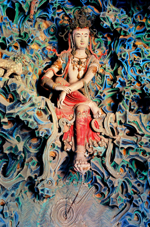 最美五彩懸朔觀音像 摩尼殿內(nèi)槽北壁為一座宋代的泥塑五彩懸山,懸山上共有佛像30余身,最引人注目的還是端坐于中間的五彩自在觀音像,俗稱“倒坐觀音”。觀音像高3.4米,左足踏蓮,右腿踞起,兩手抱膝,身體稍向前傾斜,面容秀麗恬靜,姿態(tài)優(yōu)雅端莊。柳眉之下,那雙智慧深邃的眼睛微微俯視,恰與禮佛者仰視時(shí)形成感情上的交流。這人性化了的佛像被魯迅先生稱為“東方美神”。