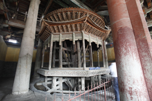 最古老的轉(zhuǎn)輪藏 轉(zhuǎn)輪藏直徑七米,是一座收藏經(jīng)文的旋轉(zhuǎn)書架,外觀形似八角形亭子,中設(shè)木軸,亭身設(shè)有經(jīng)屜,可以存放佛經(jīng),推之可轉(zhuǎn)動(dòng)。取佛教“法輪常轉(zhuǎn),自動(dòng)不息”之意,喻佛法猶如輪子輾轉(zhuǎn)相傳,永不停息。佛教中亦有推其旋轉(zhuǎn)與誦讀經(jīng)文同功之說。這種建筑形制國(guó)內(nèi)保存下來的甚少,主要有四川平武報(bào)恩寺華嚴(yán)店和北京智化寺藏殿的明代轉(zhuǎn)輪藏、北京頤和園萬壽山和山西五臺(tái)山塔院寺大藏經(jīng)閣清代轉(zhuǎn)輪藏、正定隆興寺轉(zhuǎn)輪藏閣內(nèi)的宋代轉(zhuǎn)輪藏,因此稱其是中國(guó)現(xiàn)存最早的轉(zhuǎn)輪藏。