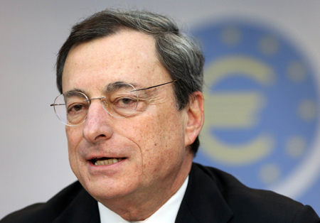 歐洲央行12月5日宣布將主要再融資利率維持在0.25%的歷史低點。歐洲央行還將明年的通脹預期由1.3%下調(diào)至1.1%,顯示出歐元區(qū)經(jīng)濟復蘇形勢依然脆弱;并將明年的經(jīng)濟增長預期由1%上調(diào)至1.1%。歐洲央行行長德拉吉表示,未來將繼續(xù)維持低利率政策,但未提出任何額外的寬松措施。圖為德拉吉當天在新聞發(fā)布會上發(fā)言。