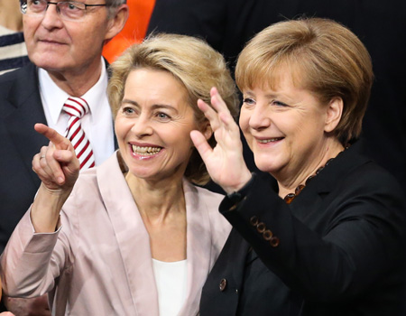 12月17日,在德國柏林國會(huì)大廈,默克爾(右)與新任國防部長烏爾蘇拉·馮德萊恩出席會(huì)議。德國聯(lián)邦議院當(dāng)天舉行總理選舉投票表決,默克爾再次連任新一屆聯(lián)邦政府總理。