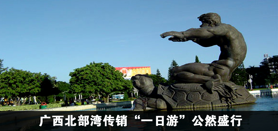 一路上,“導(dǎo)游”對(duì)高速公路、廣告牌、大型公共建筑進(jìn)行了聯(lián)想解讀,并帶領(lǐng)游客重點(diǎn)游覽了防城港市政廣場(chǎng)前的海洋文化公園。記者看到,馬路邊停了七八輛旅游大巴和幾輛小巴,廣場(chǎng)各處有五六個(gè)參觀團(tuán)數(shù)百人在參觀,“導(dǎo)游”們都拿著刺耳的高音喇叭大聲宣講:“防城港遍地都是黃金”“北部灣是金融特區(qū),但這個(gè)政策具有隱蔽性”“這個(gè)雕塑上面一條魚、下面很多魚,告訴大家要做最上面那條魚,把你的家族全部帶過來發(fā)財(cái)致富”……