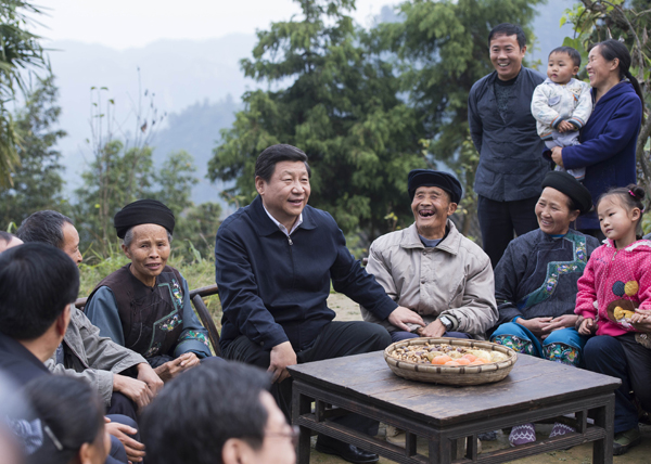 2013年11月3日至5日,中共中央總書(shū)記、國(guó)家主席、中央軍委主席習(xí)近平在湖南考察。這是3日下午,習(xí)近平在湘西土家族苗族自治州花垣縣排碧鄉(xiāng)十八洞村同村干部和村民座談。新華社記者 王曄 攝