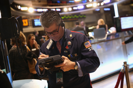 1月13日,一名交易員在美國紐約證券交易所工作。 由于投資者在美國大銀行財報公布前拋盤離場,紐約股市三大股指13日下跌。截至當(dāng)天收盤,道瓊斯工業(yè)平均指數(shù)比前一個交易日跌179.11點(diǎn),收于16257.94點(diǎn)。標(biāo)準(zhǔn)普爾500種股票指數(shù)跌23.17點(diǎn),收于1819.20點(diǎn)。納斯達(dá)克綜合指數(shù)跌61.36點(diǎn),收于4113.30點(diǎn)。