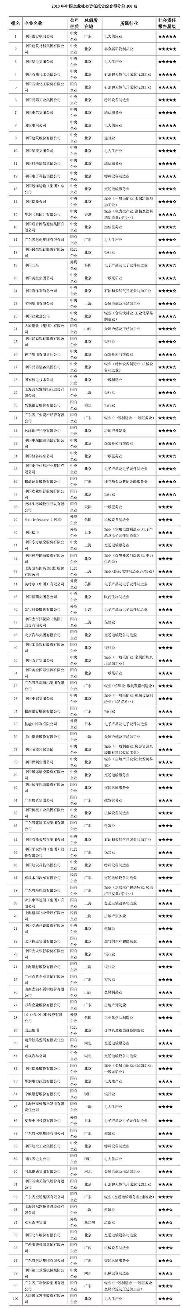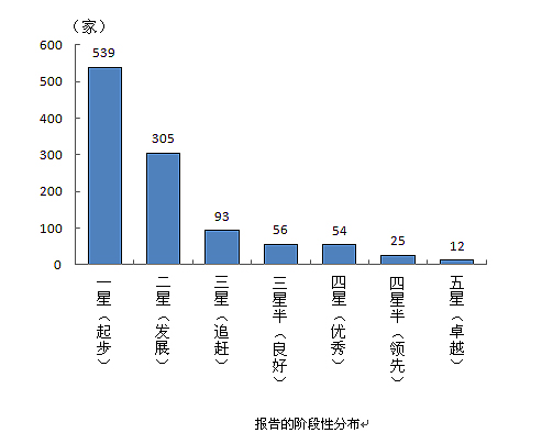 2013年,中國(guó)企業(yè)社會(huì)責(zé)任報(bào)告平均分由去年的31.7分上升為35.3分,整體處于發(fā)展階段。中國(guó)南方電網(wǎng)公司、中國(guó)建筑材料集團(tuán)有限公司、中國(guó)華電集團(tuán)公司、中國(guó)石油化工集團(tuán)公司、中國(guó)石油化工股份有限公司、中國(guó)兵器工業(yè)集團(tuán)公司、中國(guó)電信集團(tuán)公司、國(guó)家電網(wǎng)公司、中國(guó)建筑股份有限公司、中國(guó)華能集團(tuán)公司、中國(guó)移動(dòng)通信集團(tuán)公司、中國(guó)電子科技集團(tuán)公司等12家企業(yè)的報(bào)告達(dá)到五星級(jí),處于卓越階段;25家企業(yè)的報(bào)告達(dá)到四星半級(jí),處于領(lǐng)先階段;54家企業(yè)的報(bào)告為四星級(jí),處于優(yōu)秀水平;56家企業(yè)的報(bào)告為三星半級(jí),處于良好水平;93家企業(yè)的報(bào)告為三星級(jí),處于追趕水平;305家企業(yè)的報(bào)告為二星級(jí),處于發(fā)展水平;539家(49.7%)企業(yè)的報(bào)告只有一星級(jí),處于起步階段。