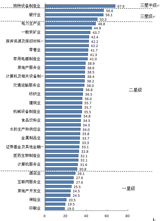 行業(yè)間企業(yè)社會(huì)責(zé)任報(bào)告質(zhì)量差距較大,特種設(shè)備制造業(yè)得分為67.6分,處于三星半(良好)水平;電力供應(yīng)業(yè)、銀行業(yè)、石油和天然氣開(kāi)采業(yè)與加工業(yè)得分分別為56.6分、56.1分、50.3分,處于三星(追趕)水平;電力生產(chǎn)業(yè)、通信服務(wù)業(yè)、一般采礦業(yè)、交通運(yùn)輸設(shè)備制造業(yè)、廢棄資源及廢舊材料回收加工業(yè)等34個(gè)行業(yè)社會(huì)責(zé)任報(bào)告綜合得分位于30-50分之間,處于二星級(jí)(發(fā)展)水平;酒店業(yè)、農(nóng)林牧漁業(yè)、互聯(lián)網(wǎng)服務(wù)業(yè)、文化娛樂(lè)業(yè)、房地產(chǎn)開(kāi)發(fā)業(yè)、木材加工與家具制造業(yè)等9個(gè)行業(yè)的得分在30分以下,處于一星級(jí)(起步)水平。各行業(yè)社會(huì)責(zé)任報(bào)告得分及階段分布如圖0-15所示。
