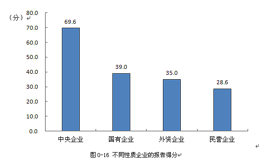 從國(guó)有企業(yè)、民營(yíng)企業(yè)、外資企業(yè)三類性質(zhì)企業(yè)的社會(huì)責(zé)任報(bào)告質(zhì)量來(lái)看,國(guó)有企業(yè)得分(39.0分)和外資企業(yè)(35.0分)高于民營(yíng)企業(yè)(28.6分)得分,處于發(fā)展(二星級(jí))階段,而民營(yíng)企業(yè)報(bào)告尚處于起步(一星級(jí))階段。值得肯定的是,國(guó)有企業(yè)中的中央企業(yè)社會(huì)責(zé)任報(bào)告綜合得分為69.6分,處于良好(三星半)水平。