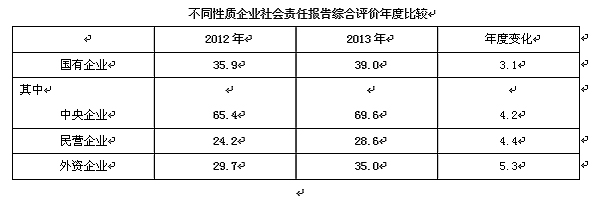 與去年相比,國(guó)有企業(yè)社會(huì)責(zé)任報(bào)告綜合得分由35.9分提高到39.0分,上升了3.1分,國(guó)有企業(yè)中的中央企業(yè)從65.4分提高到69.6分,上升了4.2分;民營(yíng)企業(yè)由24.2分提高到28.6分,增長(zhǎng)了4.4分,但仍然處于起步(一星級(jí))階段;而外資企業(yè)則由去年的29.7分提高到35.0分,從起步(一星級(jí))階段提高到發(fā)展(二星級(jí))階段。